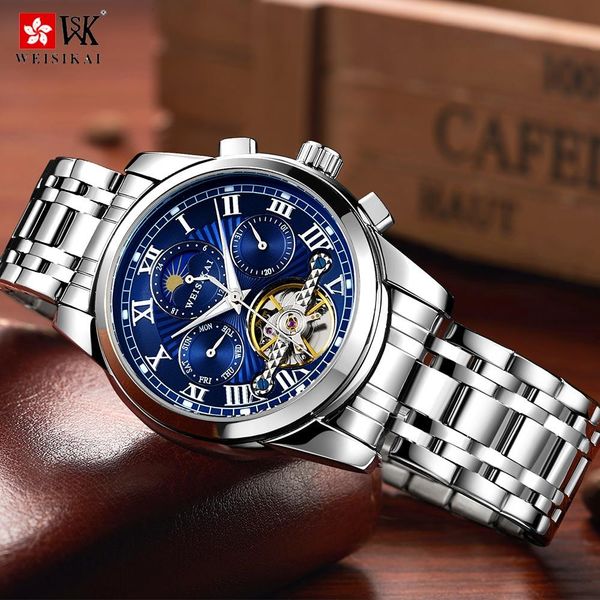 weisikai blue tourbillon steel watch male matic mechanical watch multi function calendar watches men waterproof clock hollow jllmgl, Silver