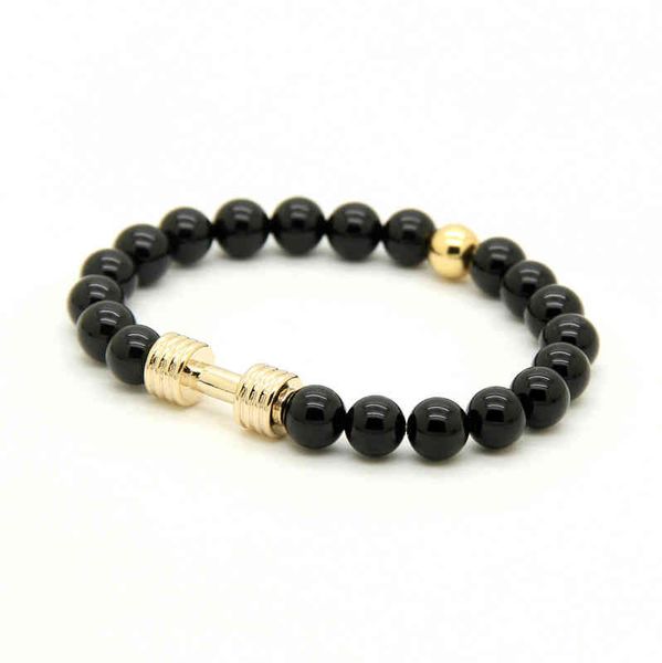 wholale real gold & platinum plated metal new barbell & 8mm a grade black onyx stone fitns fashion dumbell bracelets, Golden;silver