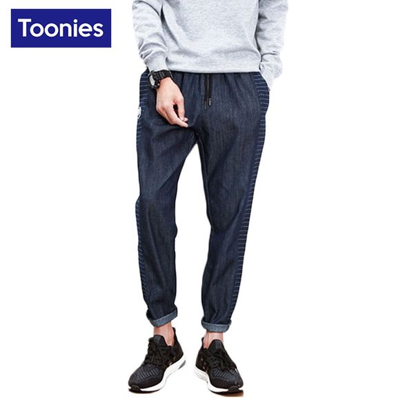 wholesale- men's biker jeans men 2017 spring street new fashion side striped denim blue elastic waist plus size male mens haren pants j
