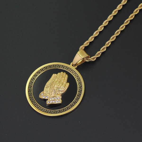 wholesale-stainless steel jewelry hip hop pray hands pendant necklace with 3mm 24inch rope chain sn121, Silver
