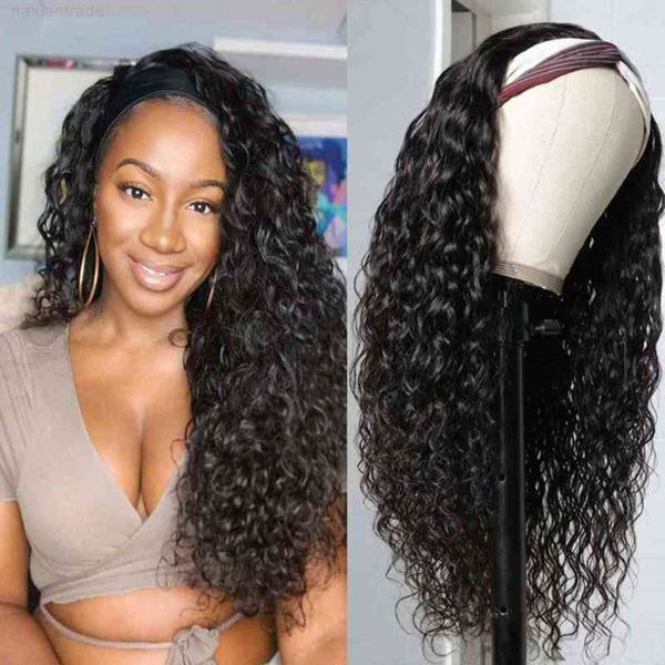 wig water wave brazilian wet and wavy headband wigs hu hair natural color 150% density, Black