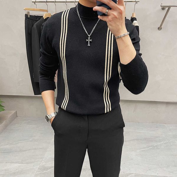 winter mens sweaters slim fit turtleneck knitted pullovers striped casual men's long sleeve warm knitwear black grey 210527, White;black