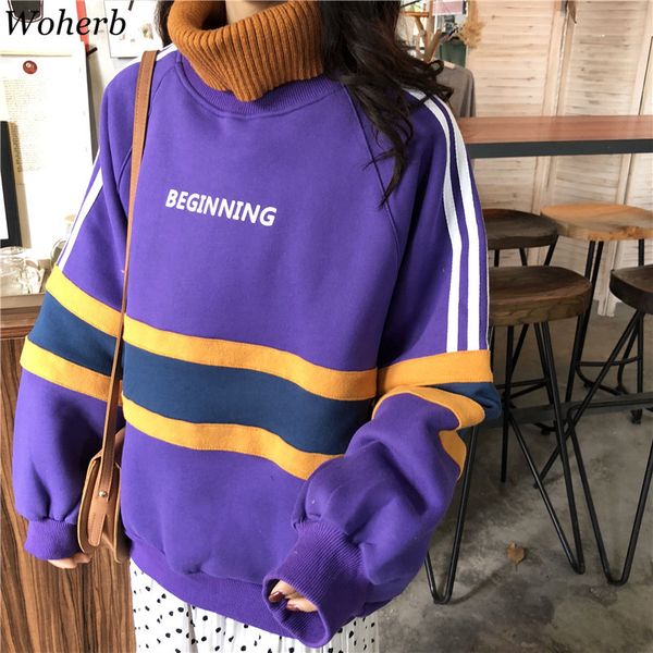 woherb корейской толстовка женщина 2020 осень зима толстой водолазка толстовка письмо печать harajuku чередование с капюшоном top streetwear, Black