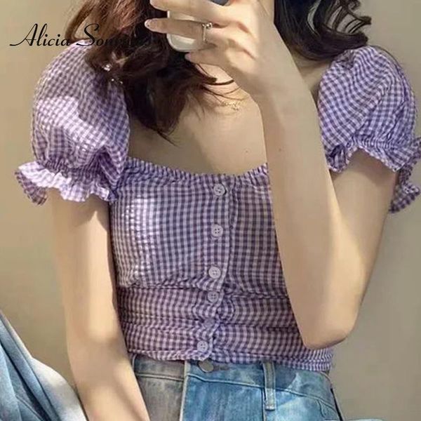 women's blouses & shirts 2021 for summer temperament puff sleeve plaid fashion colthing single-breasted short women, White