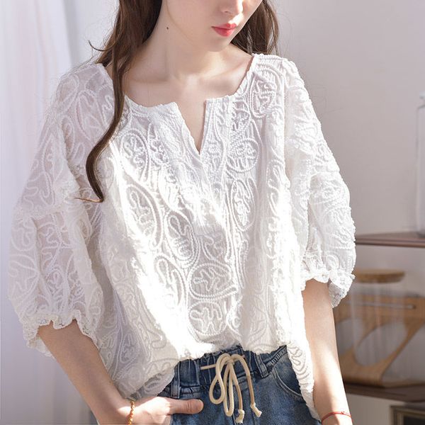 women's blouses & shirts 2021 summer korea fashion women v-neck loose embroidery lace blouse femme all-matched casual sweet plus size, White