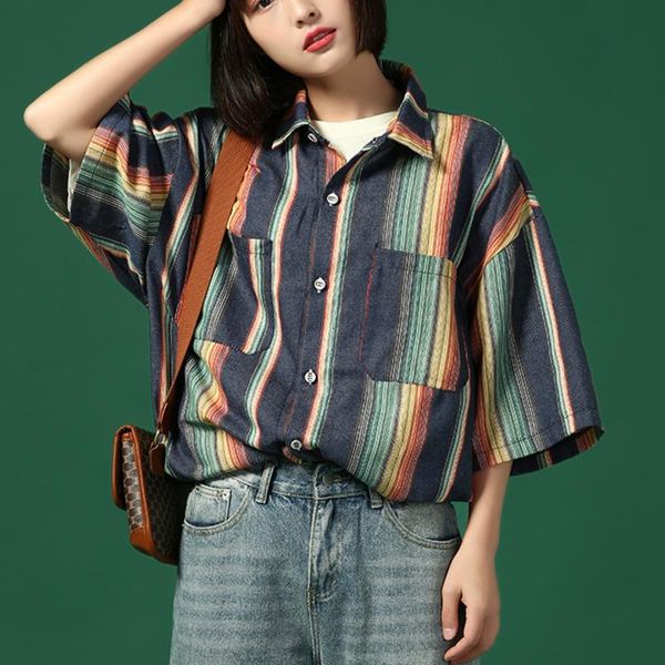 women's blouses & shirts 2021 women turn-down collar spring stripe all-match bf short-sleeve loose outwear harajuku female, White
