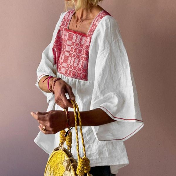 women's blouses & shirts fashion 2021 summer half sleeve casual t-shirt square neck comfy retro pattern print women blouse pullover top, White