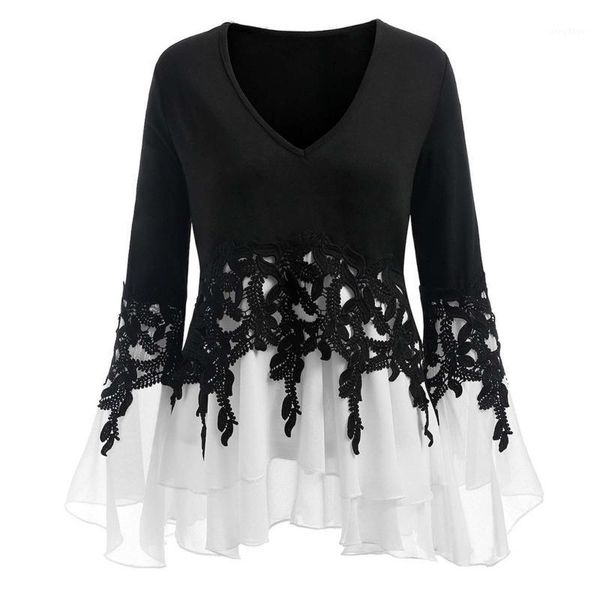 women's blouses & shirts fashion ladies women casual elegant chiffon v-neck long sleeve shirt small flare lace top, White