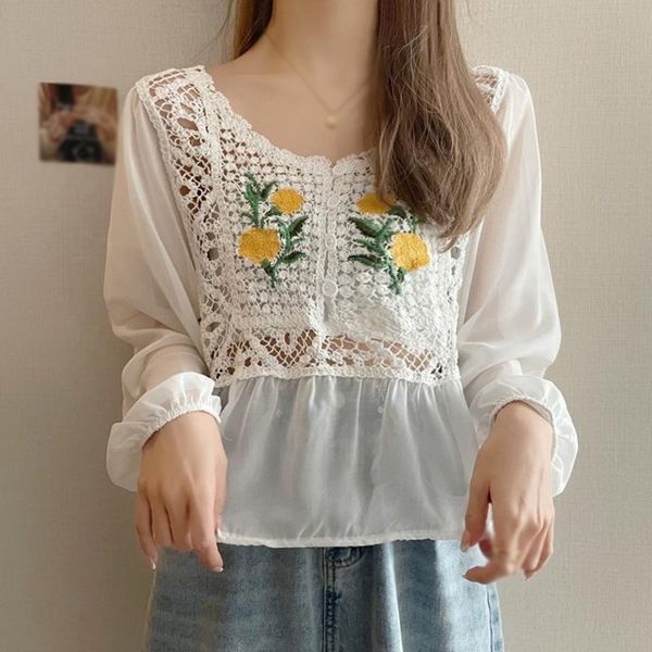 women's blouses & shirts jlong summer embroidery knitted stitching floral women blouse v-neck long sleeve button hollow out retro, White