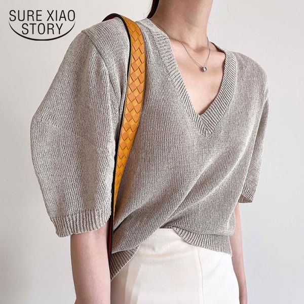 women's blouses & shirts korean loose lantern short sleeve v-neck linen knitted shirt 2021 plus size white tee woman casual blusas wom