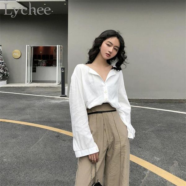 women's blouses & shirts lychee harajuku v-neck solid color female blouse shirt button long sleeve loose summer spring women, White