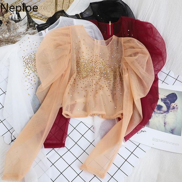 women's blouses & shirts neploe diamonds women spring summer 2021 fashion o neck puff sleeve transparent female short 80689, White