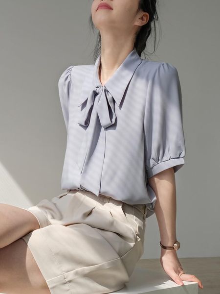 women's blouses & shirts and smoke blue chiffon drape short-sleeved shirt female summer little korean ribbon coat gentle wind, White