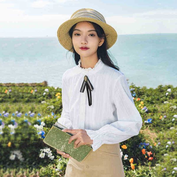 women's blouses & shirts blouses spring arrival ruffle cut out lace standing collar bow long sleeve shirt 1l1c, White