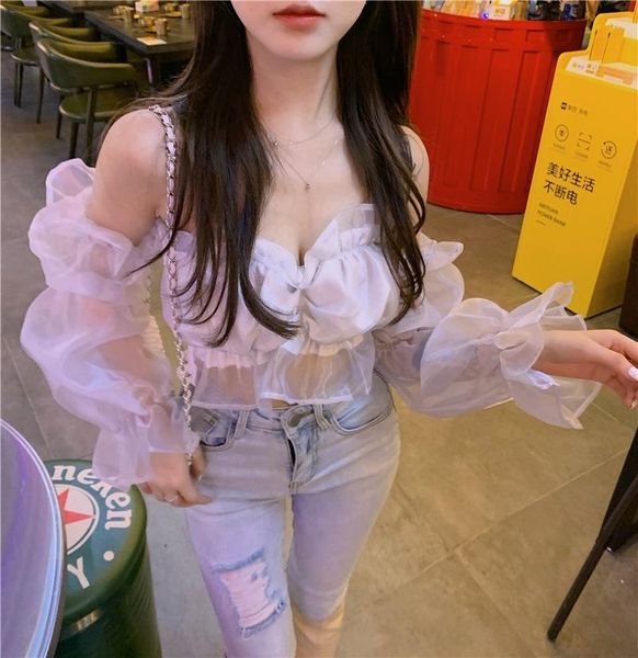 women's blouses & shirts spring and summer 2021 slim long-sleeved off-shoulder shirt japanese kawaii soft girl short chiffon women, White