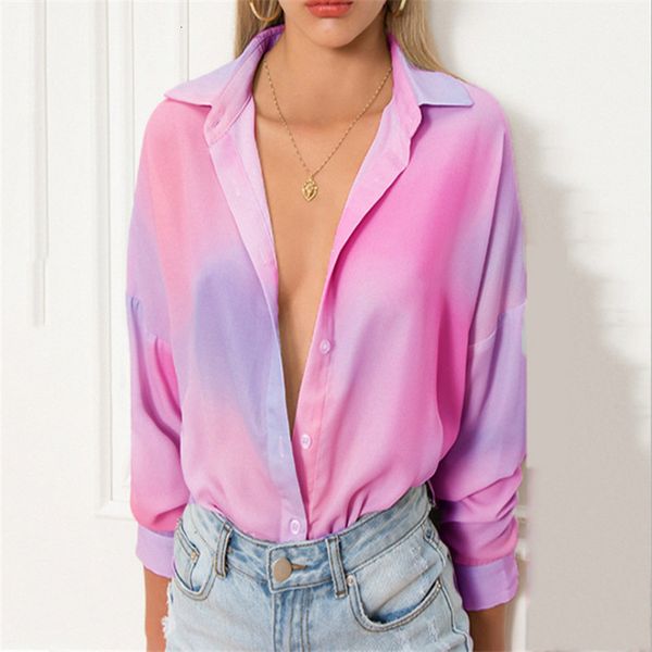 women's blouses & shirts tie dyed women fashion lapel neck long sleeve single breasted loose blouse casual womens designers clothes, White