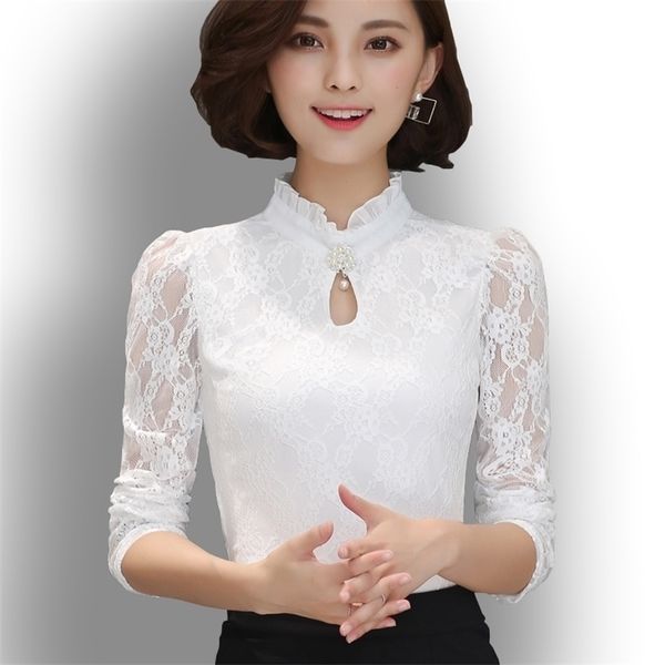 women's chiffon lace blouses fiminina blusa long puff sleeved shirt ruffled button plus size 6xl 220312, White