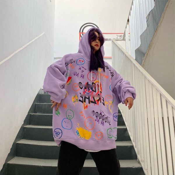 women's hoodies & sweatshirts 2021 fashionwomen autumn winter loose streetwear hooded sweatshirt graffiti harajuku couple fleece jacket, Black