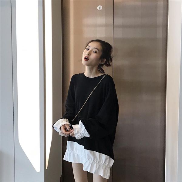 women's hoodies & sweatshirts clothing patchwork o-neck fold knitted casual style spring autumn long sleeve and pullover camisa feminin, Black