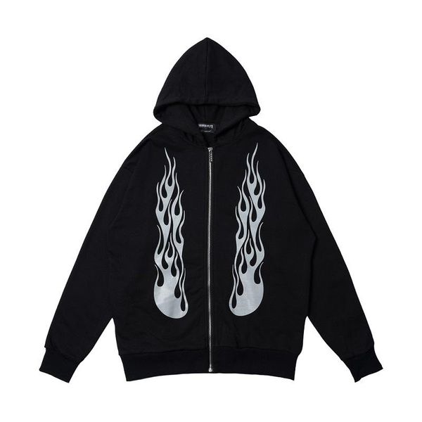 women's hoodies & sweatshirts loose women flame printed zipper mens hip hop hipster rock streetwear hoodie clothes sweatshirt, Black