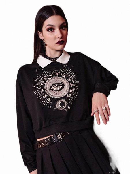 women's hoodies & sweatshirts romwe dark academia eye & moon graphic contrast collar sweatshirt l1jo#, Black