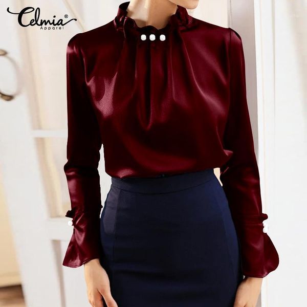 women's fashion satin blouse 2020 celmia autumn long sleeve elegant shirts casual office silk solid pearl plus size blusas 71, White