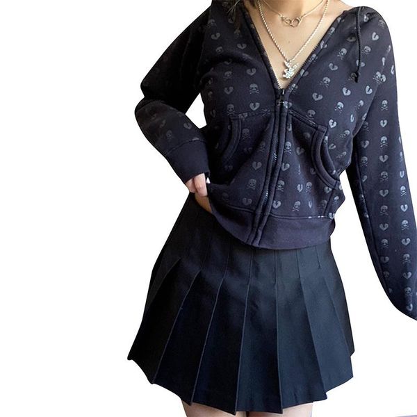 women's jackets printing hooded sweatshirt woman long sleeve skulls zipper hoodie female 2021 fall winter lace up casual lady overcoat, Black;brown