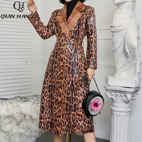 women's jackets qian han zi wanita desainer kasual leopard jas hujan kebesaran kulit paten ular dicuci sabuk pakaian ramping 230328, Black;brown