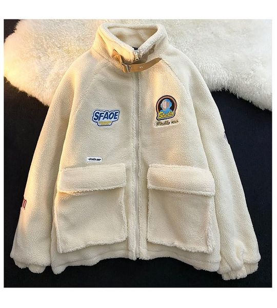 women's jackets tide harajuku loose faux lamb wool coats female chic embroidered patchwork pilot style thick warm streetwear ins, Black;brown