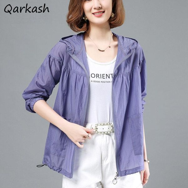 women's jackets women leisure loose summer sun-proof solid color pleated pockets zippers female outerwear all-match with hat ins, Black;brown