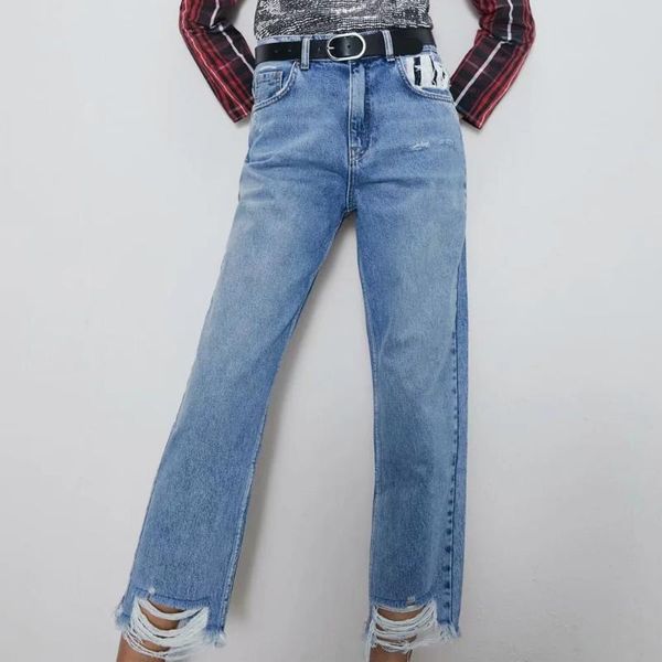 women's jeans 2021 women pantalon frayed loose ankle-length high waist ripped denim pants pocket casual hole straight cylinder trousers, Blue