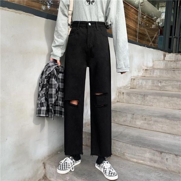 women's jeans spring and autumn korean style large size high waist ripped for plump girls women straight chic loose slimming daddy wide, Blue