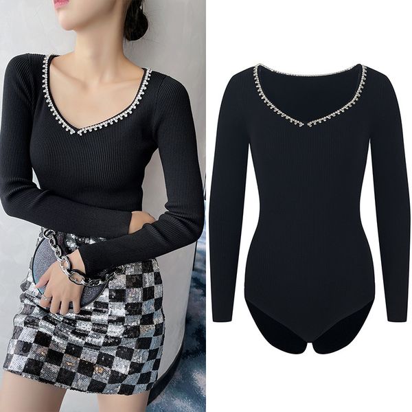 women's jumpsuits & rompers bodysuit women with v-neck neck cleavage playsuits suits long sleeve diamond thin jumper solid korean blac, Black;white
