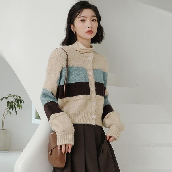 women's knits & tees short empired patchwork knitted women sweater cardigan winter 2021 o-neck long-sleeved loose thicken warm female o, White