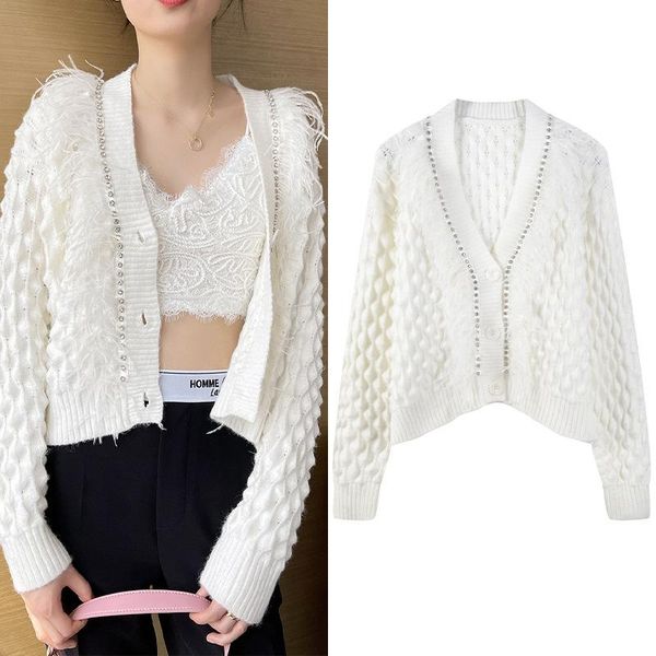 women's knits & tees spring autumn women sweater cardigans white knit v-neck diamonds long sleeve sweet casual streetwear harajuku kor