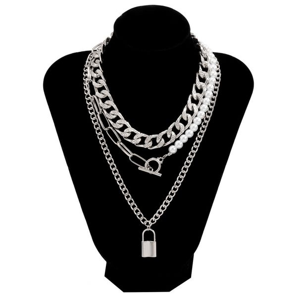 women's layered thick chain choke loop lock chain pendant men's asymmetric pearl bead necklace fashion designer design gift, Silver