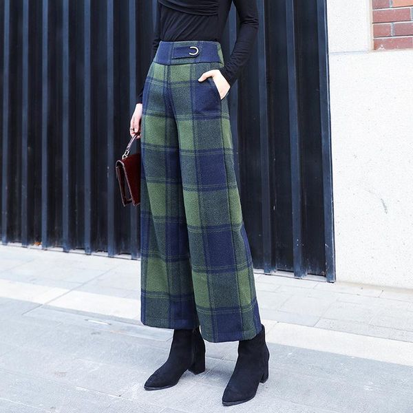 women's pants & capris green plaid women winter woolen thick ankle length wide leg high waist england british style trousers 2843ly, Black;white