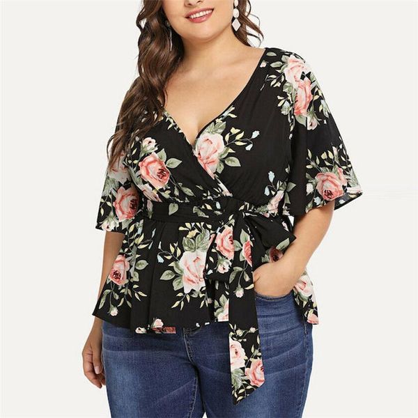 women's plus size floral pint blouse lady female half sleeve v neck criss-cross lace up belt shirt summer casual loose blouses & shirts, White