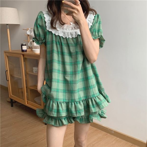 women's sleepwear 2021 women plaid lace pajama sets comfortable summer soft sweet casual femme loose cotton two piece suits hkwk, Black;red