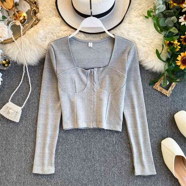 women's spring autumn hong kong style retro square neck long-sleeved shirt zipper short all-match female qx959 210507, White