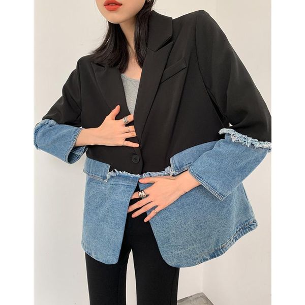 women's suits & blazers denim patchwork women blazer jacket single button black suit loose fashion lady coat 2021 autumn, White;black