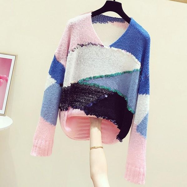 women's sweaters 2021 sprin autumn women long sleeve pullovers sequins v-neck loose color knitted casual feminine, White;black