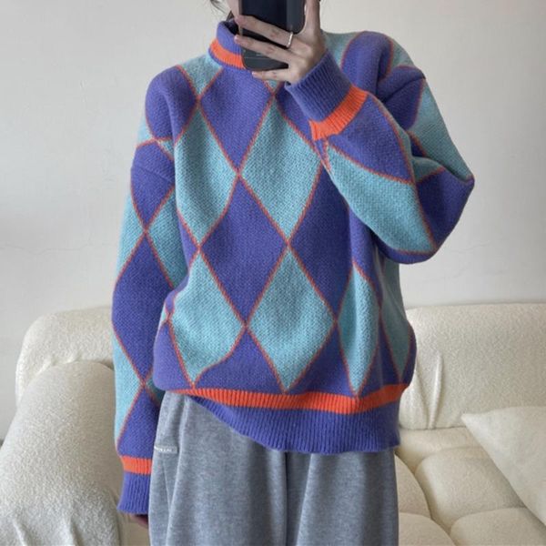 women's sweaters contrast diamond check sweater autumn winter warm round neck pullover chic age reducing loose women, White;black