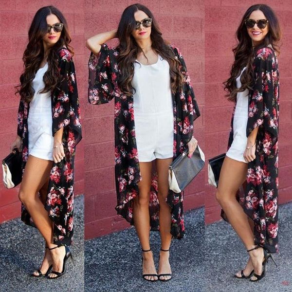 women's swimwear 2021 summer women boho floral cover open cape casual coat loose long sleeve, White;black