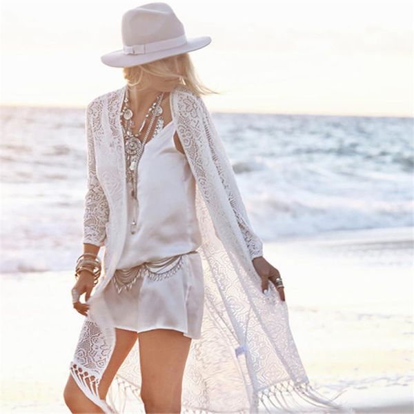 women's swimwear tassel lace bikini cover up women see through pareo beach cardigan kaftan tunic oversize bathing suit ups plus size, White;black