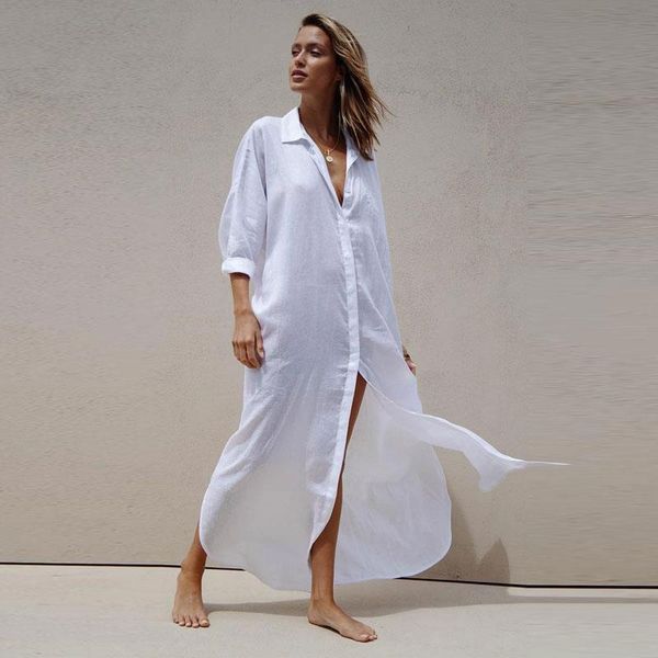 women's swimwear white beach maxi dress cotton cover up women plus size loose summer wear long sleeve bathing suit ups, White;black