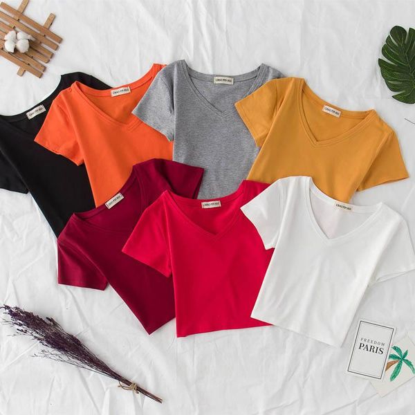 women's t-shirt 2021 exposed navel short-sleeved female summer slim v-neck cotton short tight bottoming shirt high waist top, White