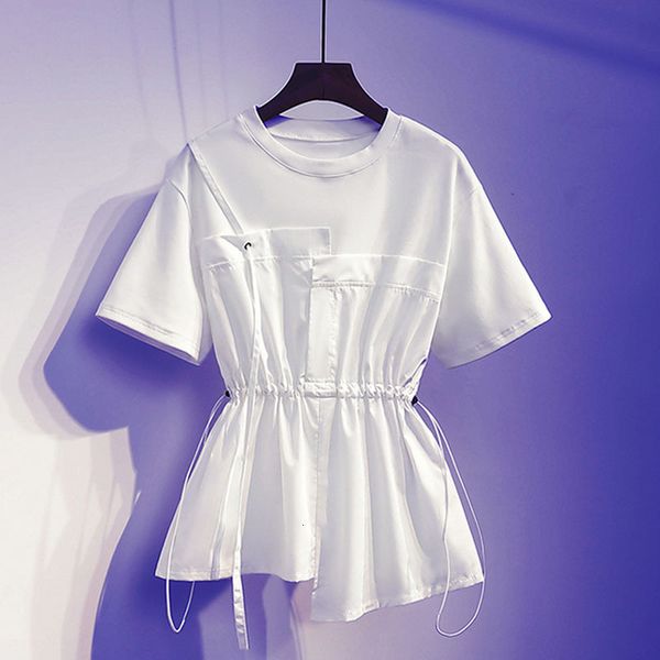 women's t-shirt casual 4xl women tees summer fashion patchwork short sleeve t-shirt waist banding korean chic tshirts 230414, White