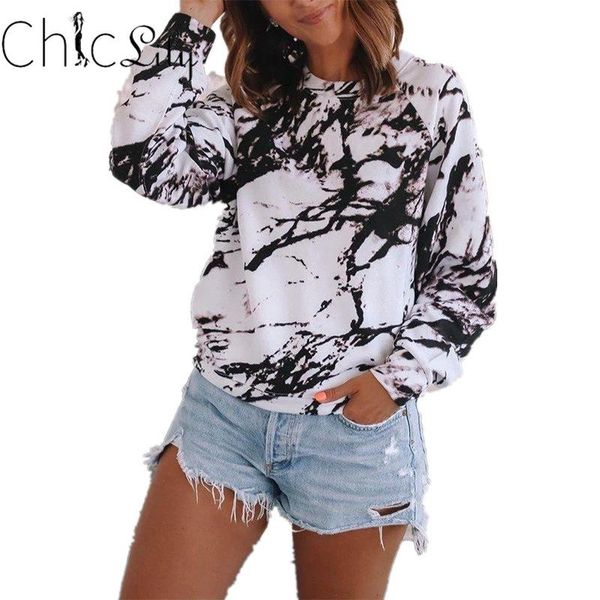 women's t-shirt chiclily tie-dye print long sleeve t-shirts women loose o-neck female shirt casual woman tee, White
