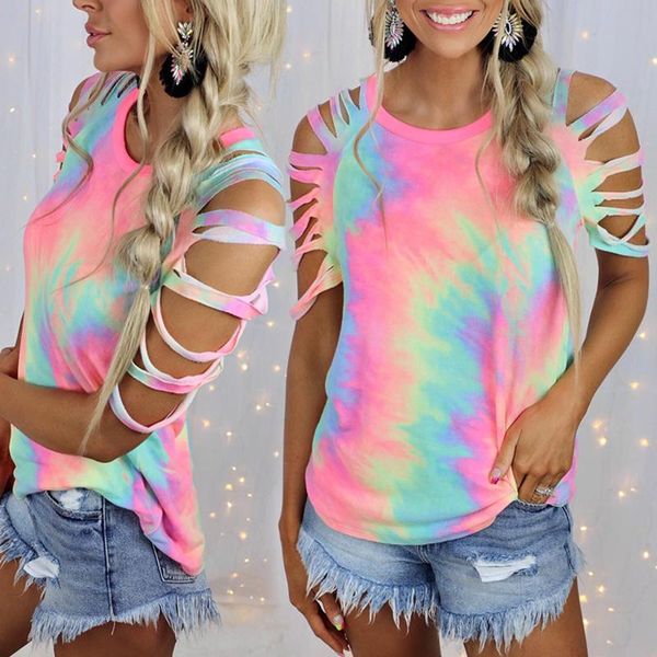 women's t-shirt cold shoulder for ladies 2021 summer fashion womens tie-dye print short-sleeved strapless casual round neck, White